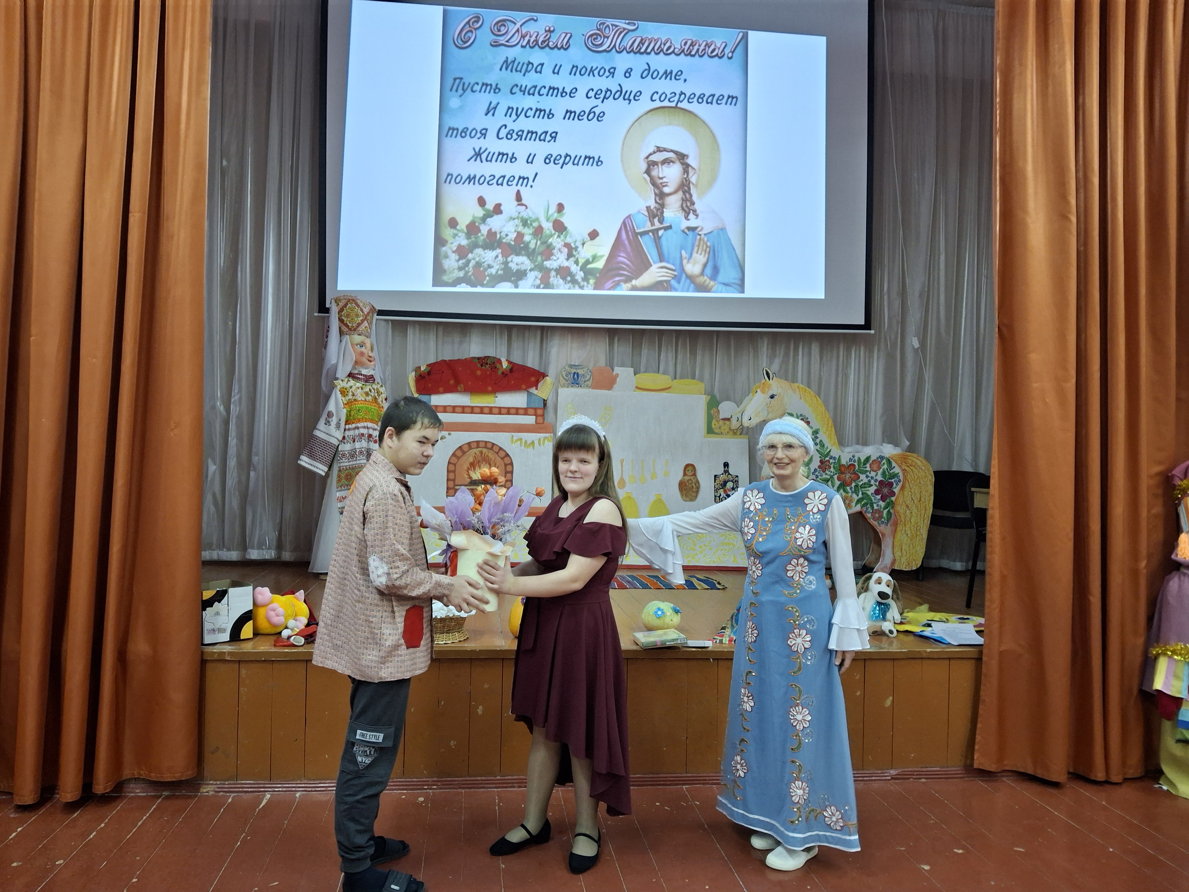 В этот день все Татьяны отмечают свои именины, а вся Россия празднует день студента. Поэтому мы от всей души поздравили наших Татьян с праздником. Мальчики-ложкари выступили с музыкальным поздравлением, а девочки выразили свои пожелания виде небольших подарков - праздничных мешочков. Все с удовольствием поиграли в народные игры, повеселились и потанцевали.