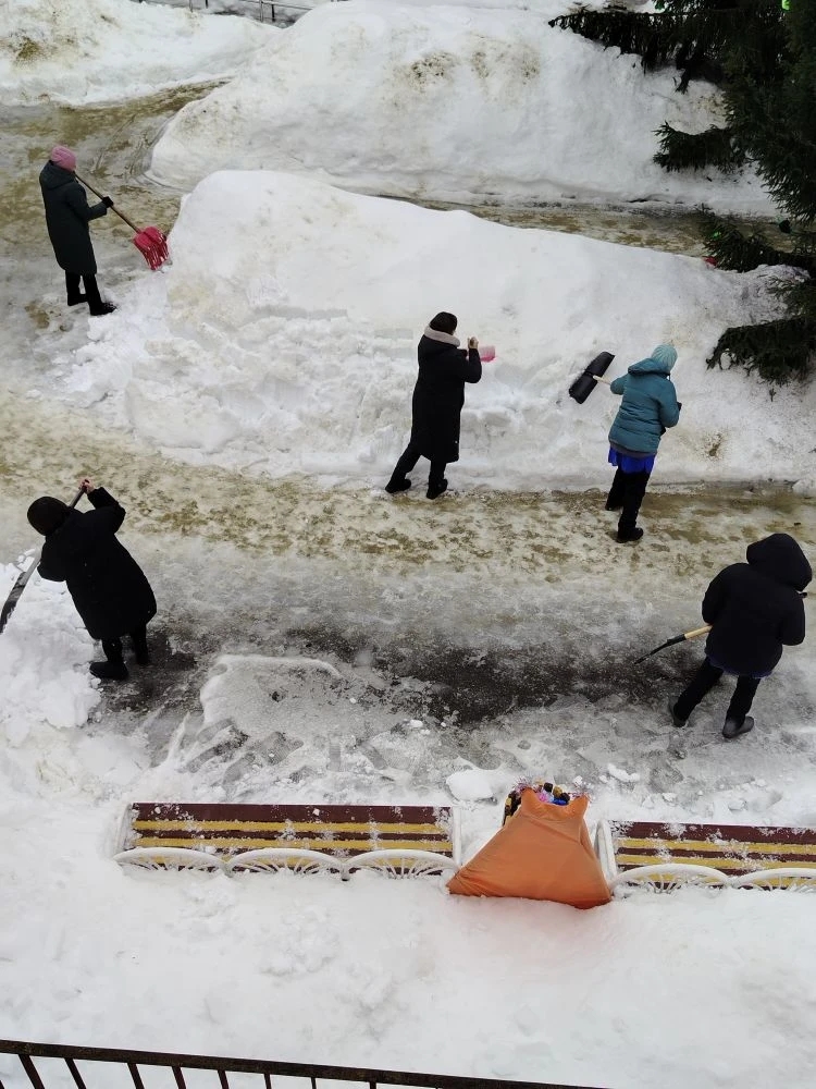 Снежные массы рыхлят как вокруг самого здания, так и вдоль пешеходных дорожек. Данная мера способствует ускоренному таянию снега и отводу талой воды.
