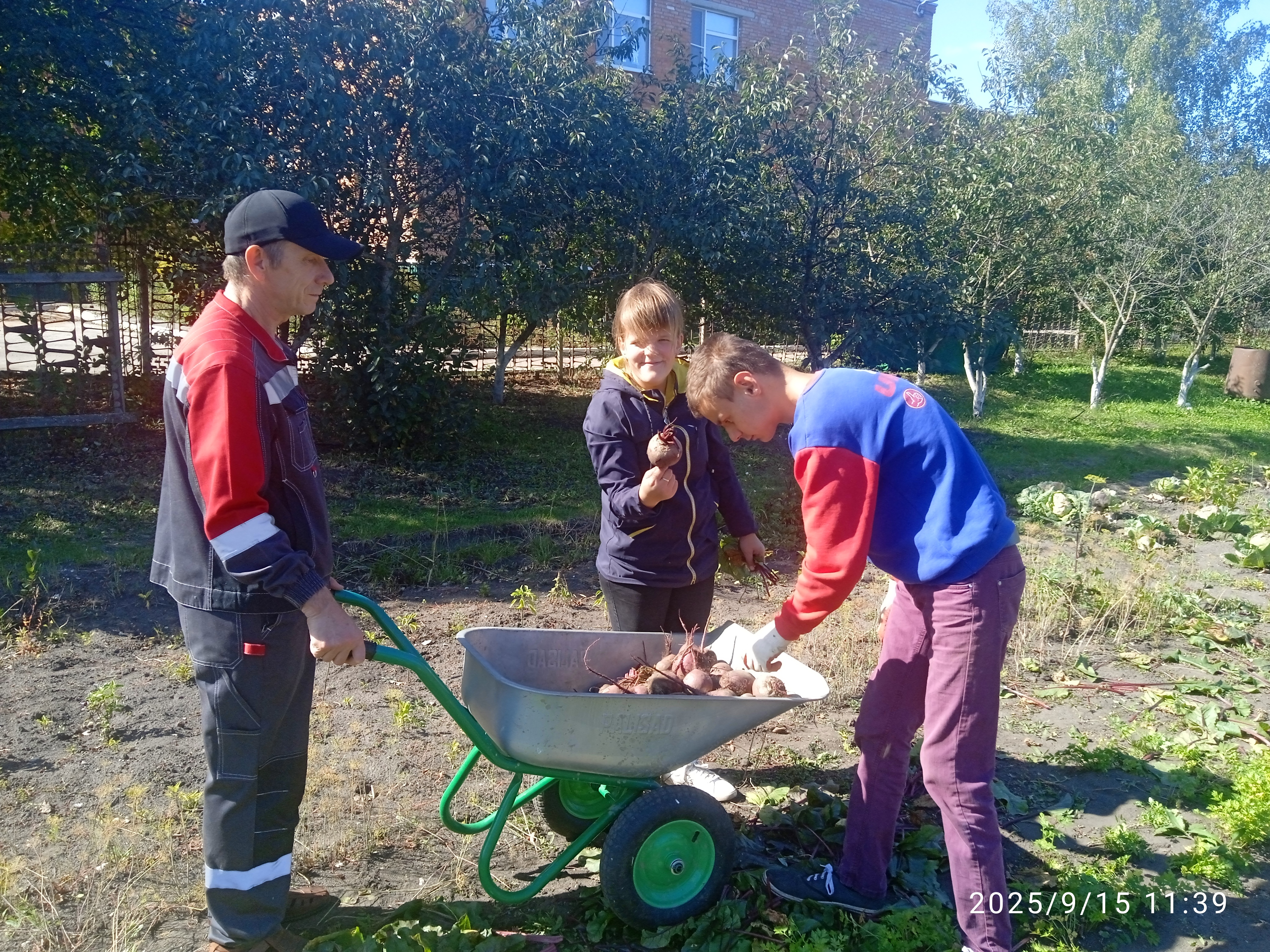 Все лето дети и воспитатели детского дома ухаживали за растениями: поливали, пололи, рыхлили. И вот наступила волшебница-осень. Пришла пора убирать урожай. Огород в этом году порадовал детей и взрослых, вырастили: свеклу, лук, тыкву, капусту, кабачки, петрушку, помидоры и огурцы. Сбор урожая вызывает у воспитанников огромную радость, чувство гордости за свой труд.