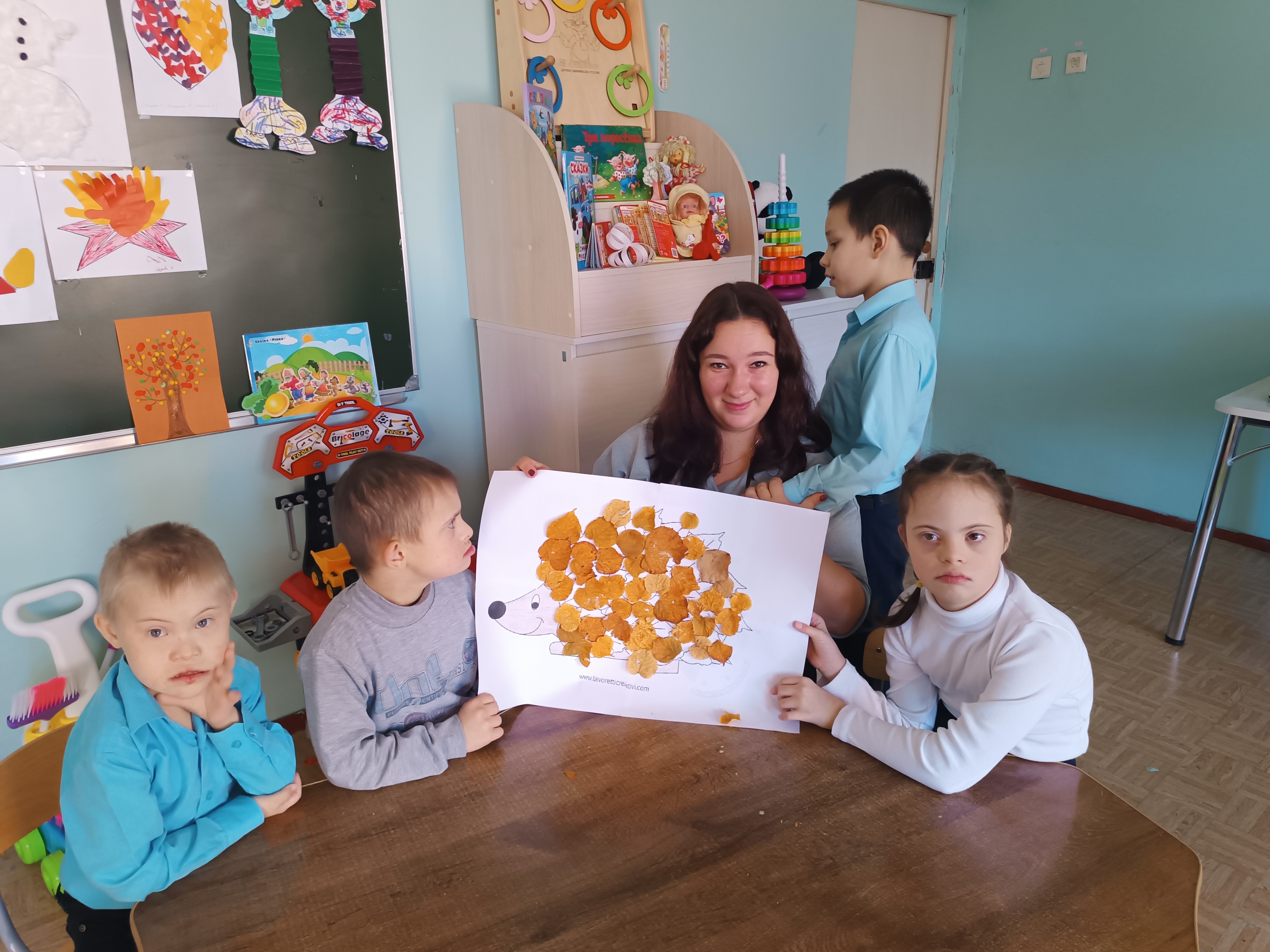Кульминацией занятия стала аппликация «Осенний ёжик». На столе появились контур милого зверька, разноцветные листья, клей и ножницы. Дети совместно с учителем-дефектологом старались сделать ёжика красивым и сказочным.